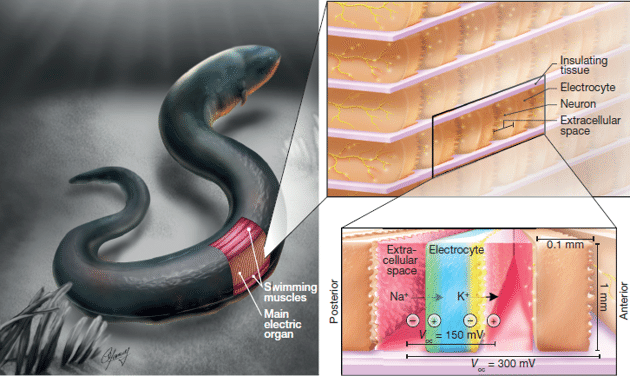 電鰻是一種淡水魚類,能通過特化的肌肉組織放電。它們的體長可達兩米,而放電器官的長度就可達體長的80%。在放電器官中有數以千計的特化肌肉細胞,稱為“放電體”(electrocyte)。每個放電體只能產生很小的電壓,但數千個放電體合在一起,就能產生高達600伏的電壓,足以擊倒一個人,甚至一匹馬。電鰻的放電機制為伏打提供了發明電池的靈感,使他稱為一位19世紀的名人。
