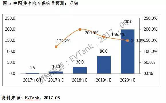 在中國(guó)市場(chǎng),EVTank在研究報(bào)告中認(rèn)為中國(guó)汽車共享市場(chǎng)正處于產(chǎn)業(yè)發(fā)展初期,且已經(jīng)呈現(xiàn)出巨大的市場(chǎng)發(fā)展?jié)摿Α=刂沟?017年Q1,EVTank的統(tǒng)計(jì)數(shù)據(jù)顯示,國(guó)內(nèi)在運(yùn)營(yíng)的共享汽車已經(jīng)達(dá)到4.5萬(wàn),以新能源汽車為主。EVTank預(yù)計(jì)到2020年,國(guó)內(nèi)共享汽車的運(yùn)營(yíng)車輛累計(jì)將達(dá)到200萬(wàn)輛,成為全球最大的共享汽車市場(chǎng)。