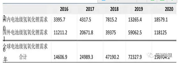 2016-2020年動力鋰電池氫氧化鋰需求測算