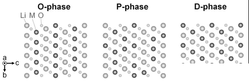 下圖為完全有序結構、部分有序結構和無序結構的NCA材料的晶體結構示意圖,分別用O-相,P-相和D-相來表示,作者認為NCA材料在結構衰變中可能存兩種結構,一種是雙層結構,即有序結構O相的上下表面分別存在無序結構D相,即D/O和O/D,另外一種三層結構,即在有序相O相和無序相D相之間存在過渡相P相,也就是D/P/O和O/P/D結構。