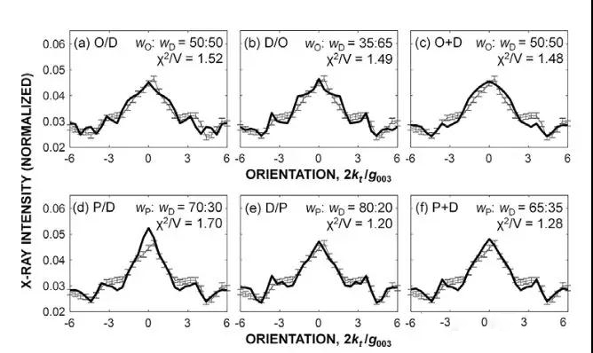 下圖為Yu Yamamoto分別采用O/D、D/O結構模型和O/P/D、D/P/O結構模型對NCA材料的Ni-K曲線進行擬合的結果,可以從圖中看到采用雙層結構的O/D結構擬合效果并不好,擬合優度在1.5左右,而我們在模型中引入部分有序相(P-相)后能夠看到材料的擬合效果明顯提高了,擬合優度也提高到了1.3以下(擬合優度最大為1,越接近1則表示擬合的越好),表明引入部分有序相的模型能夠更好的模擬實驗結果。
