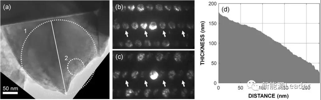 下圖為NCA材料的TEM圖像,圖b和c分別為顆粒中央和邊緣位置的投射、衍射光斑,其中用箭頭標出的位置為衍射光斑,當NCA從有序層狀結構轉變為無序的巖鹽結構時,箭頭表示的光斑結構會逐漸變弱、消失,我們對比顆粒邊緣(圖c)和中央位置(圖b)的衍射圖案可以發現,顆粒邊緣的衍射光斑亮度較弱,表明可能顆粒邊緣位置的NCA已經大部分轉變為無序的巖鹽結構。