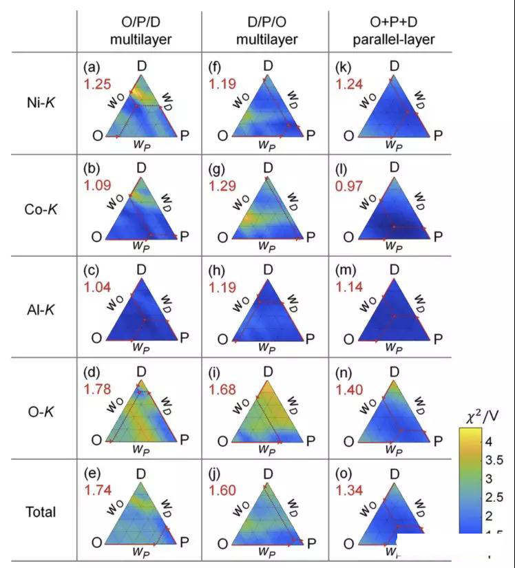 下圖為反應擬合優度與O、P、D三種物相比例之間關系的三角圖,其中Wo+Wp+Wd=1,分別對Ni、Co、Al、O的K線進行擬合,從總的擬合結果來看,O/P/D模型的最佳擬合優度為1.7,其中Wo: Wp: Wd = 0:70:30,D/P/O模型的最佳擬合優度為1.6,Wo: Wp: Wd = 10:80:10,而擬合程度最好的為O+P+D平行層模型,Wo: Wp: Wd = 30:40:30,擬合優度達到1.3左右。