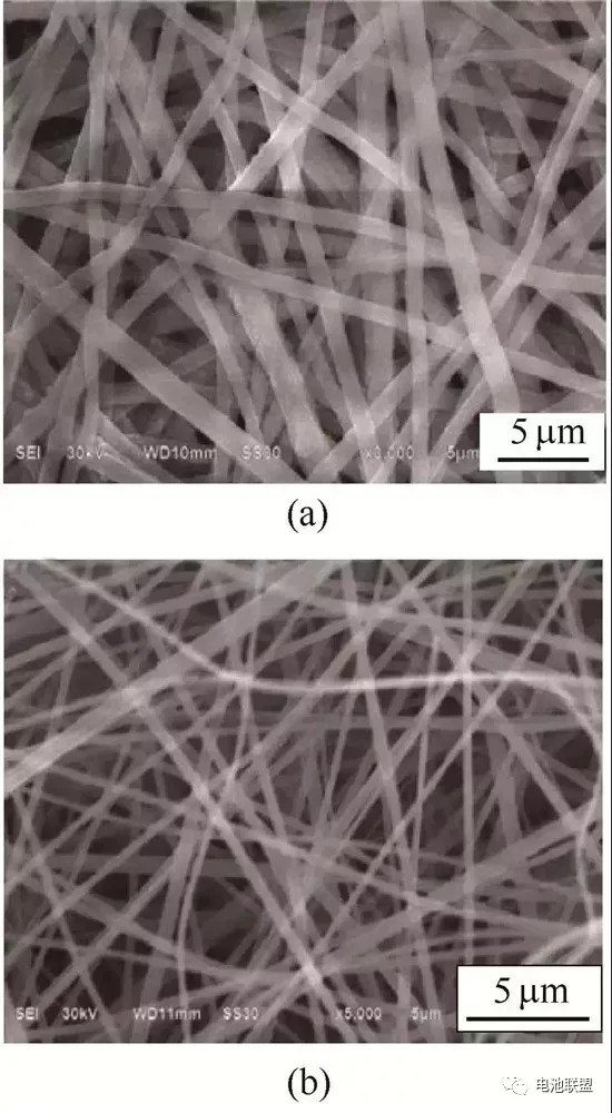 湘潭大學肖啟珍等(2012)用靜電紡絲法制備了PET納米纖維隔膜,制造出的納米纖維隔膜具有三維多孔網狀結構,如(b)圖,纖維平均直徑300nm,且表面光滑。