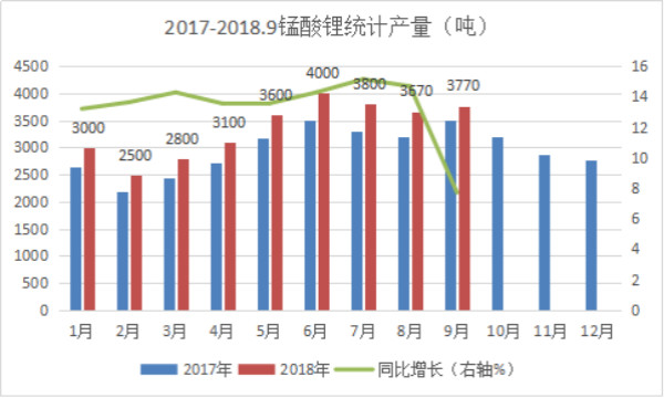 1—9月份錳酸鋰統計產量3.02萬噸,同比增長13.1%。值得注意的是,由于錳酸鋰需求情況較好,2018年以來新增不少新廠家,但尚未納入統計之中,故錳酸鋰實際產量和增速都會高于目前的統計量。