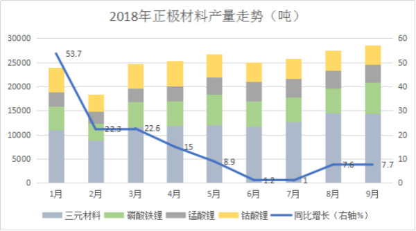 1—9月正極材料合計產量22.63萬噸,同比增長13%,全年增速呈現前高后低態勢,主要是2017年下半年產量遠高于上半年所致。