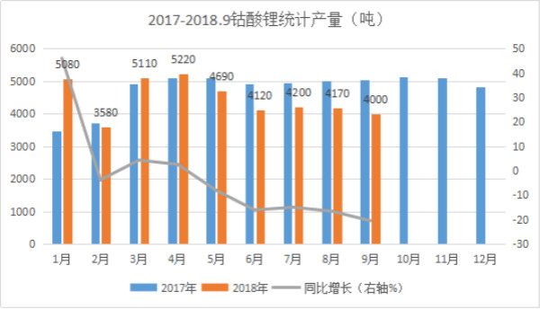 1—9月份鈷酸鋰統計產量4.02萬噸,同比下滑1.1%,4月份以來產量出現明顯下滑,數碼電池需求疲軟較明顯;