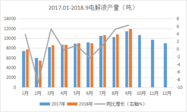 1—9月份電解液統計產量8.19萬噸,同比增長1.5%,其中下半年表現明顯強于上半年;