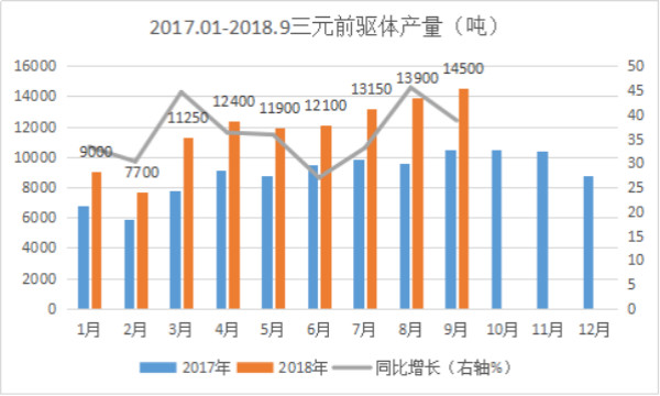 1—9月份三元前驅體統計產量10.59萬噸,同比增長36.3%;
