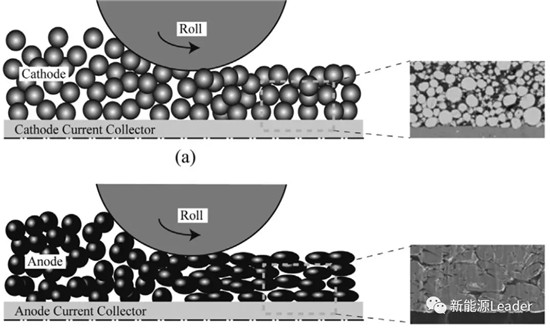 鋰離子電池中常用的正極材料,例如LiCoO2 (LCO)、LiMn2O4 (LMO)、Li(NiCoMn)O2 (NCM) 和 LiFePO4 (LFP)等都具有非常大的硬度因此碾壓的過程中不會發(fā)生變形,僅僅是發(fā)生了顆粒的重新排布。而石墨負(fù)極的顆粒相對比較軟,因此在碾壓過程中會發(fā)生塑性變形。這一點(diǎn)能夠從碾壓后的電極SEM照片中得到驗(yàn)證(如下圖所示),從圖中能夠看到正極在碾壓后顆粒仍然呈現(xiàn)球形的形狀,而負(fù)極則已經(jīng)發(fā)生了明顯的變形。因此在負(fù)極的碾壓中,不僅要考慮壓實(shí)密度對于電極孔隙率等因素的影響,還需要將負(fù)極活性物質(zhì)顆粒在碾壓過程中發(fā)生的形變考慮在內(nèi)。