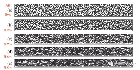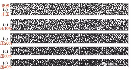 我們假設(shè)在碾壓的過程中不會破壞原有的活性物質(zhì)顆粒,而僅僅會對顆粒之間的空隙大小產(chǎn)生影響,根據(jù)上述假設(shè)作者構(gòu)建了正極和負(fù)極材料在0%、10%、20%、30%和40%壓實(shí)比例下的電極結(jié)構(gòu)(如下圖所示),在碾壓的過程中活性物質(zhì)顆粒的體積是保持不變的,但是電極之間的空隙體積會持續(xù)的降低。同時也正如前面所提到的,在碾壓過程中正極活性物質(zhì)顆粒保持了球形,而石墨材料在碾壓過程中發(fā)生了塑性形變,因此在碾壓比例較高時活性物質(zhì)顆粒從球形轉(zhuǎn)變?yōu)闄E圓形。