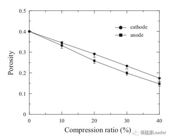 正極和負(fù)極在不同的碾壓比例下孔隙率的變化如下圖所示,從圖中能夠看到在未碾壓的狀態(tài)電極的孔隙率約為40%,隨著電極碾壓比例的提高,電極的孔隙率快速下降,一般我們認(rèn)為當(dāng)電極的碾壓厚度超過40%以后,電極的孔隙率就基本下降到0%,但是該模型預(yù)測值卻要明顯高于0,這主要是因?yàn)樵撃P褪且粋二維模型,因此允許活性物質(zhì)顆粒之間發(fā)生重疊,這也是該模型一個小的缺陷。從下圖中能夠看到在相同的碾壓比例下正極的孔隙率要高于負(fù)極,這主要是因?yàn)槟雺汉笳龢O仍然保持了球形顆粒的形狀,而負(fù)極則因?yàn)槟雺憾l(fā)生了塑性形變。