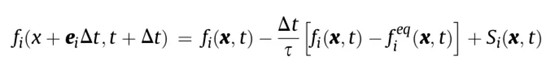 網(wǎng)格玻爾茲曼方法(LBM)來源于對理想氣體的研究,LBM中的顆粒采用分布函數(shù)(如下式所示)模擬,其中f表示在位置x和時間t的位置發(fā)現(xiàn)顆粒的可能性。