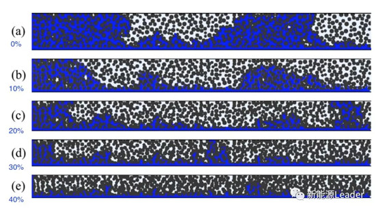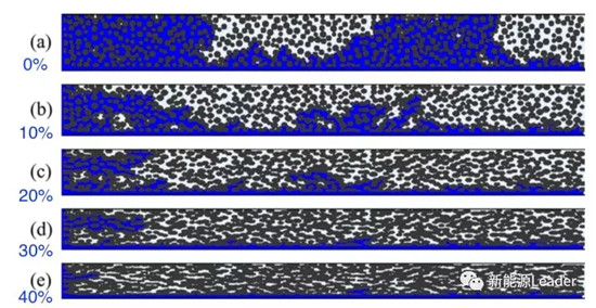 下圖為采用模型得到的不同碾壓比例的正極的電解液浸潤特性,其中藍(lán)色部分表示電解液,淺灰色部分表示電極內(nèi)部的氣體。從下圖a中能夠看到,沒有碾壓的正極材料中電解液擴(kuò)散到了大部分位置,僅有電極中間部分和尾部留有少量的空氣。當(dāng)電極碾壓10%后,在相同的時間內(nèi)從隔膜的擴(kuò)散的電解液沒有擴(kuò)散到達(dá)正極的底部。隨著碾壓比例的繼續(xù)提高,正極中的藍(lán)色區(qū)域越來越少,表明電解液在電極中的擴(kuò)散也越來越困難。