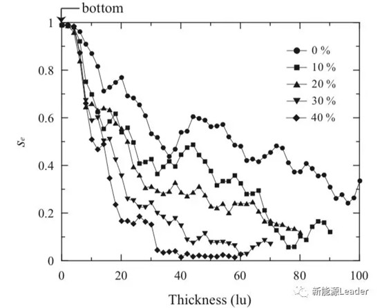 下圖為正極在厚度方向上電解液飽和度與距離電極表面距離的關(guān)系,從圖中能夠看到隨著距離電極表面距離的增加,電解液的飽和度出現(xiàn)了明顯的下降,表明電極中的電解液隨著距離電極表面的距離增加出現(xiàn)了明顯的減少。其中沒有碾壓的電極這種降低趨勢較慢,表面電解液的浸潤情況較好,而隨著碾壓密度的升高,曲線的降低速度也大大增加,表明壓實(shí)密度對于電解液的浸潤有非常大的影響。