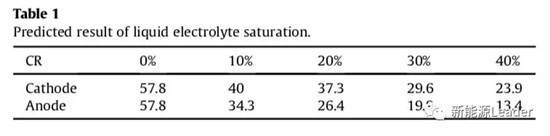 下圖為電解液在不同碾壓比例的負(fù)極中的浸潤情況,從圖中能夠看到?jīng)]有碾壓的負(fù)極同樣浸潤情況較好,從隔膜擴(kuò)散的電解液能夠到達(dá)電極的底部,但是進(jìn)行碾壓后的電極的浸潤能力就出現(xiàn)了非常大的降低。這主要是因?yàn)槭w粒在碾壓后出現(xiàn)了塑性變形,因此導(dǎo)致了電極內(nèi)部出現(xiàn)了大量不聯(lián)通的盲孔,影響了電解液在電極內(nèi)的擴(kuò)散,下表對比了在相同的碾壓比例下正極和負(fù)極電解液飽和度,從表中能夠看到負(fù)極經(jīng)過碾壓后電解液的飽和度更低,表明在相同的碾壓比例時,電解液在負(fù)極中擴(kuò)散更加困難。