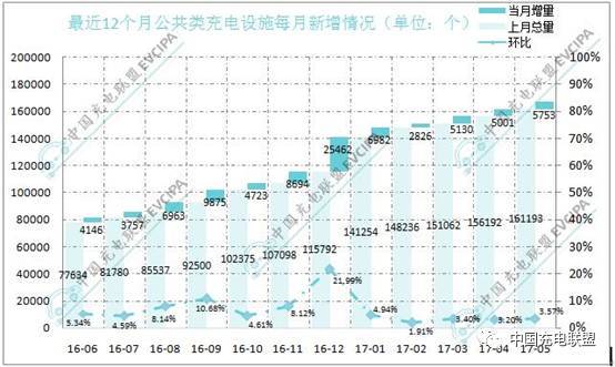 截至2017年5月,聯盟內成員單位總計上報公共類充電樁166946個,其中交流充電樁59597個、直流充電樁41275個、交直流一體充電樁66074個,2017年5月較2017年4月新增公共類充電樁5753個。從2016年6月到2017年5月,月均新增公共類充電設施約7443個,2017年5月同比增長115.0%。