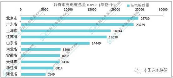 省級行政區域內所擁有的公共類充電樁數量前十的分別為:北京24730個、廣東23739個、上海18914個、江蘇18038個、山東14449個、河北8306個、安徽8208個、天津8116個、浙江6814個、湖北5149個。