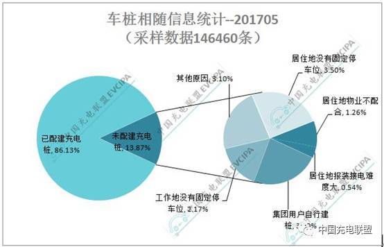 截至2017年5月,通過聯盟內成員整車企業(比亞迪、北汽、上汽、江淮、長安、東風日產、東風電動、廣汽、奇瑞、一汽)采樣車樁相隨信息數據146460條,未隨車配建充電樁占比13.87%,其中由于“集團用戶自行樁”而未能配建充電樁的占比3.30%,由于“工作地沒有固定停車位”而未能配建充電樁的占比2.17%,由于“居住地沒有固定停車位”而未能配建充電樁的占比3.50%,于“居住地物業不配合”而未能配建充電樁的占比1.26%,由于“居住地報裝接電難度大”而未能配建充電樁的占比0.54%。