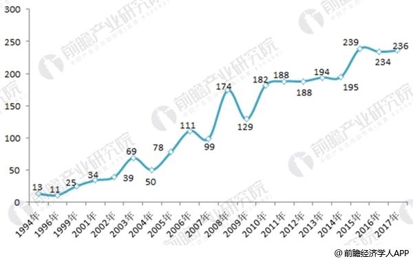 圖表2:1994-2017年我國鋁電解電容器相關專利申請數量變化圖(單位:項)
