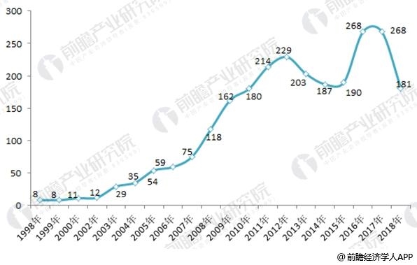 圖表3:1998-2018年鋁電解電容器相關專利公開數量變化圖(單位:項)