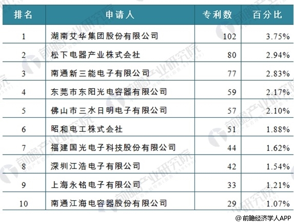 圖表4:截至2018年5月底鋁電解電容器相關專利申請人構成情況(前十位)(單位:項)