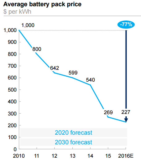 今年年初,麥肯錫發(fā)布了汽車動力電池調(diào)研報告,注意下圖,報告顯示電池平均成本從2010年的1000美元/kWh下降到了2016年的227美元/kWh。但從成本曲線走勢來看,2017年不太可能下降到145美元/kWh。不過既然是“平均電池成本”,自然有技術(shù)領(lǐng)先的企業(yè)電池成本低于227美元/kWh這一指標(biāo)。