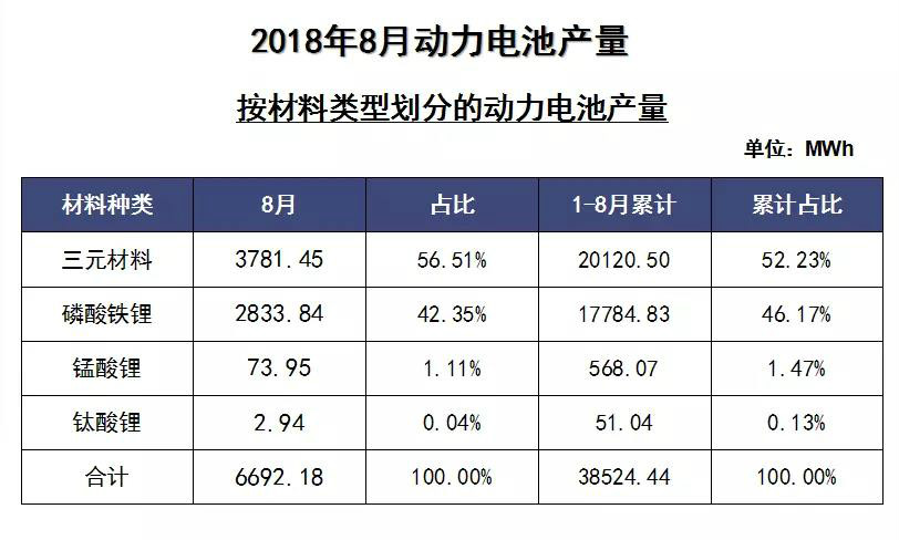 1—8月,我國動力電池累計產量達38.52GWh,其中三元電池累計生產20.12GWh,占總產量比52.23%;磷酸鐵鋰電池累計生產17.78GWh,占產量總比46.17%。
