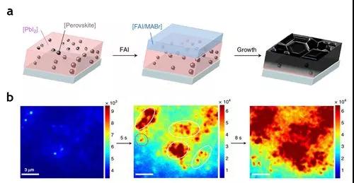 A 籽晶法制備鈣鈦礦薄膜過(guò)程示意圖;b光致發(fā)光顯微原位探測(cè)籽晶法中鈣鈦礦實(shí)時(shí)生長(zhǎng)過(guò)程