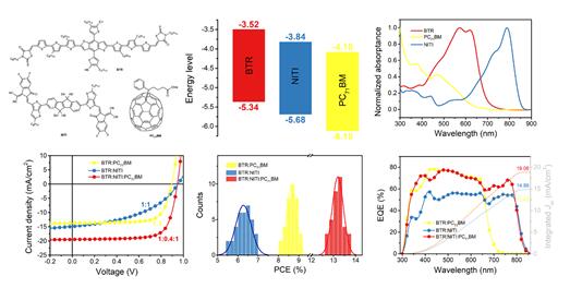 電池受限于有機材料“窄吸收”特性,二元共混薄膜難以實現對太陽能的有效寬光譜利用,并且始終存在相共混(利于激子解離)和相分離(利于電荷傳輸)這對基礎性矛盾,制約了有機光伏器件性能的進一步突破。三元有機太陽能電池保持單節電池結構,在二元活性層中引入吸收互補的第三組分,增強光譜吸收。盡管三元電池取得了一定成功,但仍面臨著嚴峻的挑戰,其核心問題在于對三元共混薄膜難以實現清晰、有效的形貌控制,用以同時保證高效的激子解離和電荷傳輸,因此,已報道三元電池性能提升幅度較低。