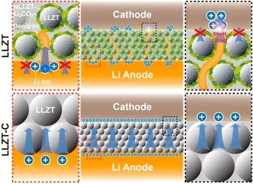 Goodenough 先生及其團隊通過對LLZTO陶瓷電解質進行高溫碳處理(LLZTO-C)成功地解決了其界面兼容性不佳的難題[4]。
