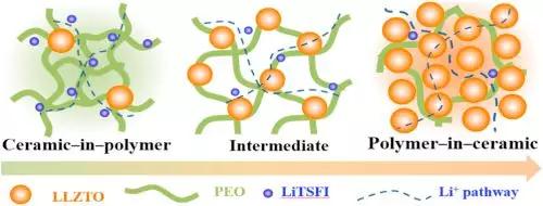 研究人員通過熱壓法制備了全系列的PEO/LLZTO復合電解質,研究發現,隨著LLZTO比例的不斷增加,復合電解質的離子傳輸機理從單相聚合物傳導向包含相界面傳導的雙相機理過渡。