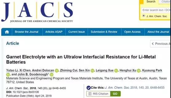 [4] Li Y, Chen X,Dolocan A, et al. Garnet Electrolyte with an Ultralow Interfacial Resistancefor Li-Metal Batteries[J]. Journal of the American Chemical Society,2018,140(20):6448-6455.