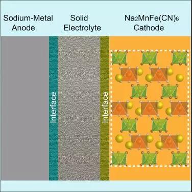 在此基礎上,Goodenough團隊選擇了鈉離子固態導體NASICON作為固態電解質組裝了高比能全固態Na/NASICON/Na2MnFe(CN)6鈉電池[6]。固態電解質的應用從根本上抑制了晶格水與液態電解液在高電位下的副反應,過渡金屬離子也不再與電解液溶劑配位溶解。相比液態電池體系,固態電池的鈉負極界面上由于副反應減少而保持著良好的離子傳輸,相應的電池庫倫效率和循環穩定性都有明顯的改善。