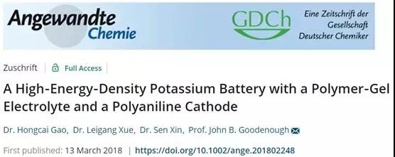 [7] Gao H, Xue L,Xin S, et al. A High-Energy-Density Potassium Battery with a Polymer-GelElectrolyte and a Polyaniline Cathode[J]. Angewandte Chemie InternationalEdition, 2018,57(19):5449-5453.