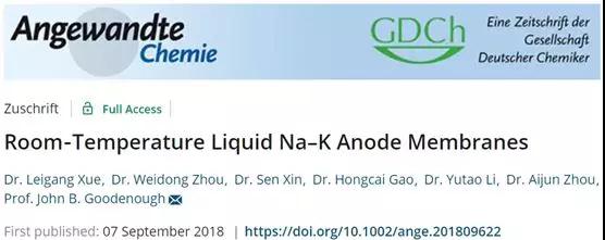 [9] Xue L, Zhou W,Xin S, et al. Room-Temperature Liquid Na-K Anode Membranes[J]. AngewandteChemie International Edition, 2018.