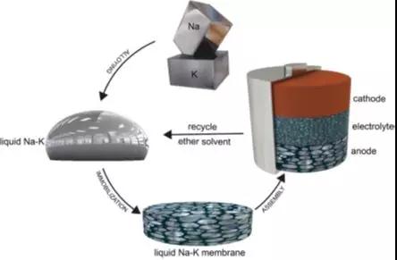 在對電解質進行優化的同時,Goodenough另辟蹊徑地利用液態合金負極有效解決了電極-電解質界面的不相容問題和枝晶生長問題。金屬鈉與金屬鉀室溫下在較寬的比例范圍內能夠形成液態合金。以此液態金屬作為二次電池負極,可以利用液體的流動性質和自愈性質實現無枝晶的負極界面。