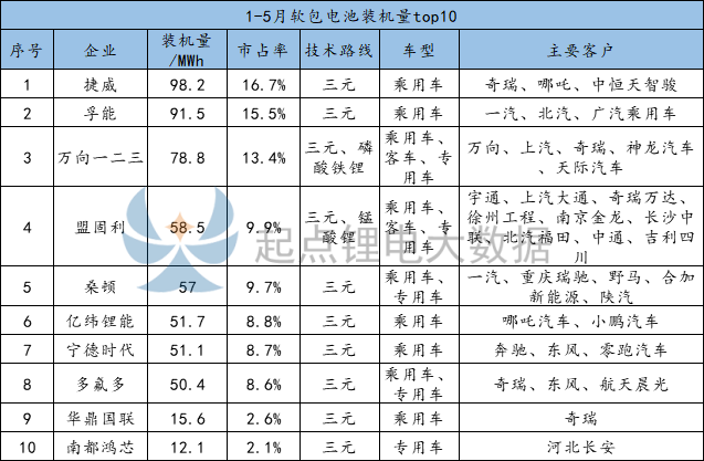 據起點鋰電大數據統計,1-5實現軟包電池裝機的企業共有22家,排名前十的企業分別是捷威、孚能、萬向一二三、盟固利、桑頓、億緯鋰能、寧德時代、多氟多、華鼎國聯和南都鴻芯,10家企業合計裝機量合計占比95.9%。