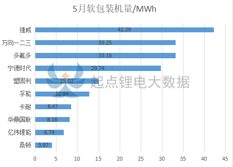 據起點鋰電大數據統計,5月軟包電池裝機量為197.4MWh,實現軟包電池裝機的企業共有13家,排名前十的企業分別是捷威、萬向一二三、多氟多、寧德時代、盟固利、孚能、卡耐、華鼎國聯、億緯鋰能、桑頓,10家企業合計裝機量193.7MWh,占整體的比重為98.1%。