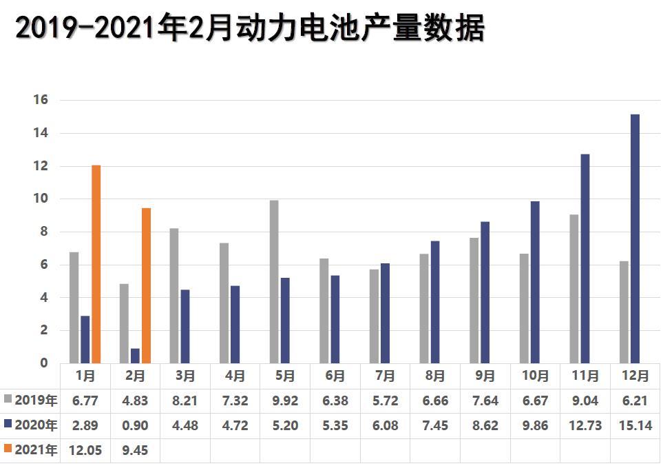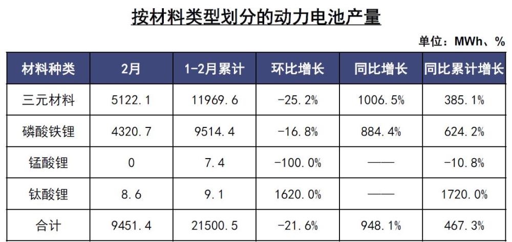 2月,我國動力電池產(chǎn)量共計9.5GWh,同比增長948. 1%,環(huán)比下降21.6%。其中三元電池產(chǎn)量5.1GWh,占總產(chǎn)量54.2%,同比增長1006. 5%,環(huán)比下降25.2%;磷酸鐵鋰電池產(chǎn)量4.3GWh,占總產(chǎn)量44.3%,同比增長884.4%,環(huán)比下降16.8%。