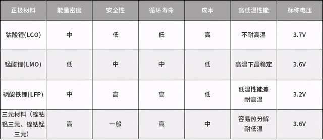 鈷酸鋰電池容量比高,但由于其存在易燃易爆等風(fēng)險,在電動自行車上已很少采用。磷酸鐵鋰電池循環(huán)壽命長、安全性好,缺點(diǎn)是在低溫時性能差、同時密度低,在相同容量下體積較大,三元鋰多為軟包,更加耐低溫,安全性一般。