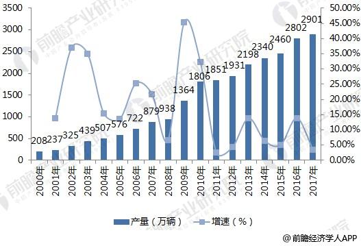 圖表1:2000-2017年中國汽車產(chǎn)量及增速(單位:萬輛,%)