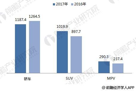 圖表2:2016-2017年全國轎車、SUV、MPV銷量(單位:萬輛)