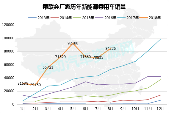 據(jù)乘聯(lián)會(huì)廠家數(shù)據(jù),2018年8月新能源乘用車銷量達(dá)到8.4萬臺(tái),同比增長六成。2018年1-8月新能源乘用車銷量達(dá)50萬臺(tái),同比增長1倍。