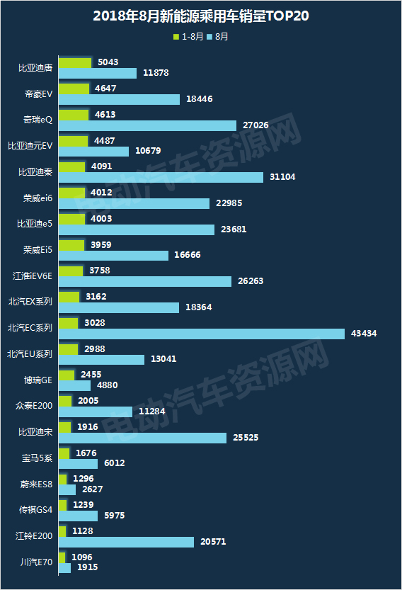 8月新能源乘用車銷量排行出爐 比亞迪唐/帝豪EV/奇瑞eQ分列前三