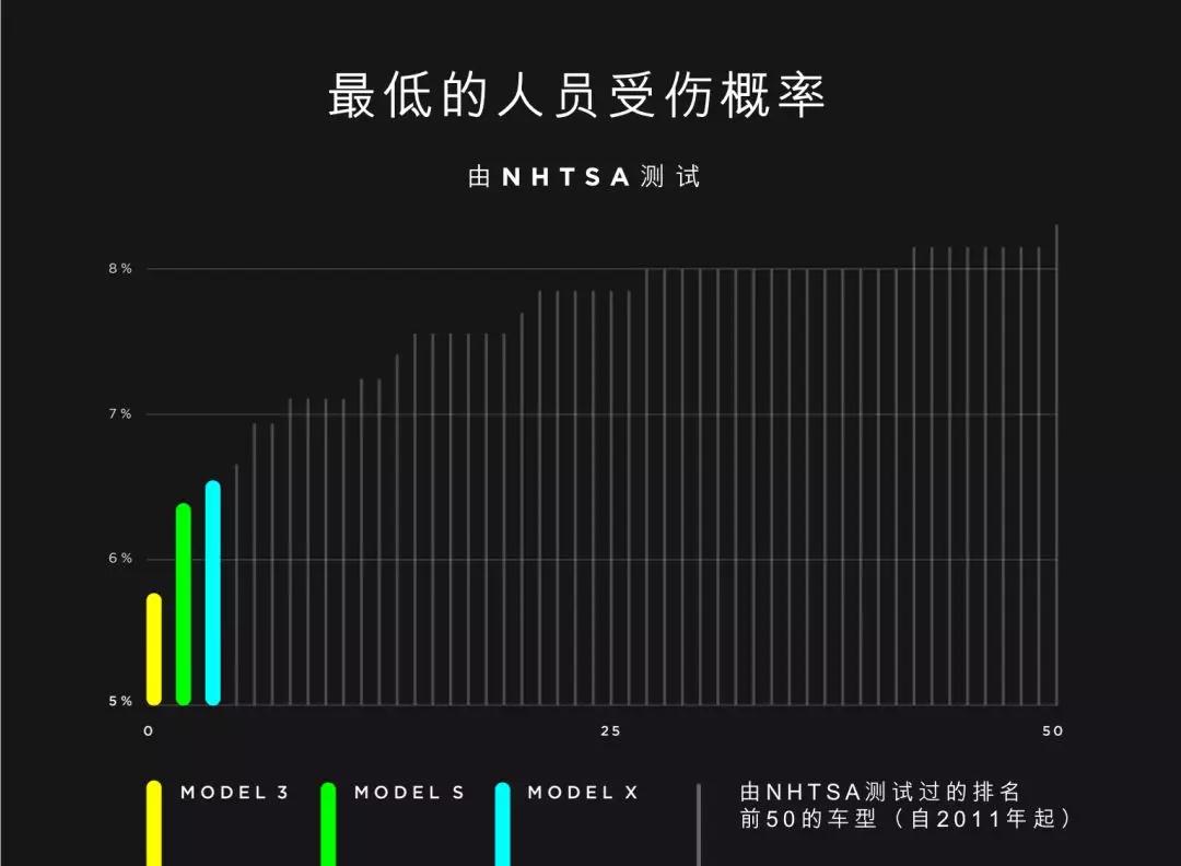基于 Model S 和 Model X 的先進架構,特斯拉設計了 Model 3,將其打造成有史以來最安全的電動汽車。在先前接受美國國家公路交通安全管理局(NHTSA)測試的車型中,Model S 的人員受傷概率是最低的,Model X 則緊隨其后,名列第二。如今,Model 3 不僅在每個類別和子類別中獲得全五星安全評級,并且NHTSA的測試還顯示,在所有接受過測試的車型中,Model 3 的人員受傷概率是最低的。