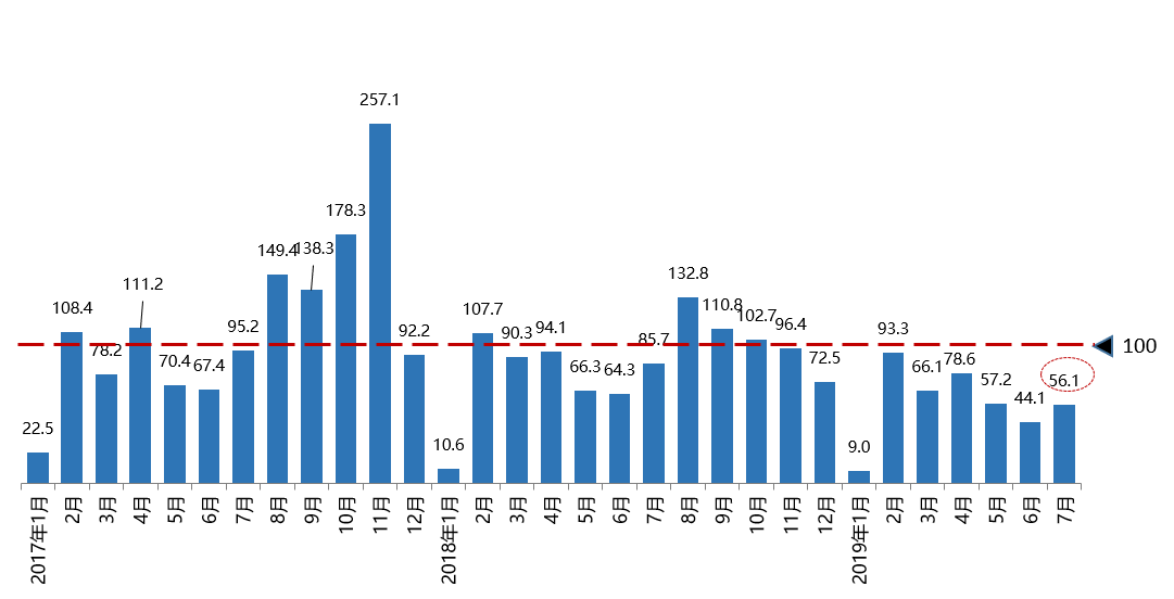 2019年7月份購買分指數為57.1,仍處低位區間,預計8月份消費者實際購買意愿并不高。