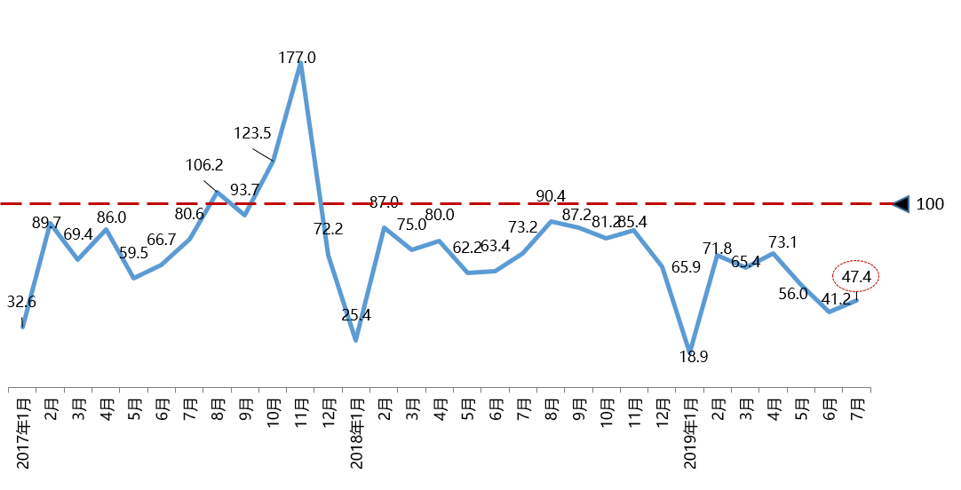 2019年8月2日,中國汽車流通協會發布最新一期“汽車消費指數”:2019年7月汽車消費指數為47.4,預計8月份銷量較7月份有所上升,但受到國五國六切換的影響,市場表現仍然一般。