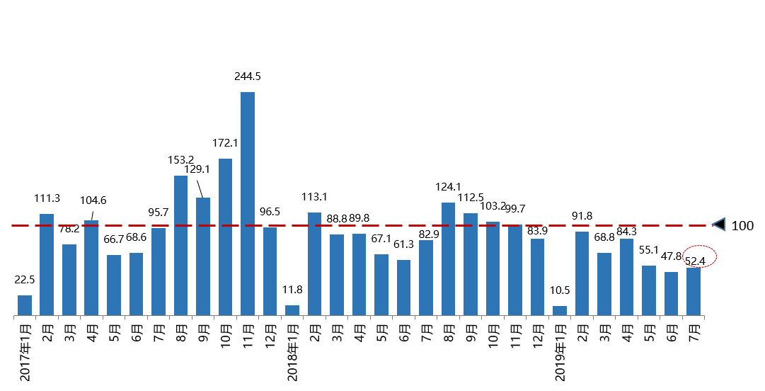 2019年7月份入店分指數為52.4,預計消費者在8月份入店看車意愿偏低。