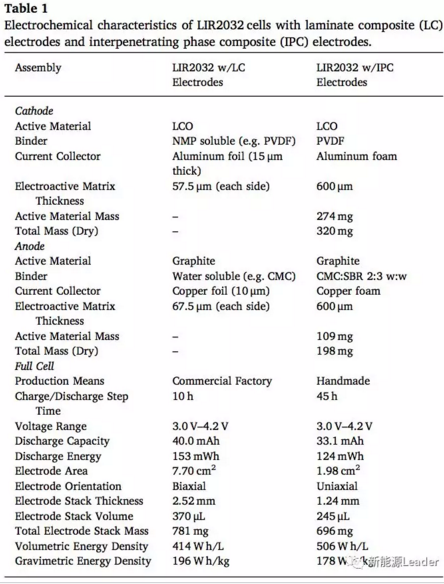 下表中作者對比了普通商業2032型扣式電池和泡沫集流體2032扣式電池的電性能,從表中我們在重量能量密度上普通商業2032扣式電池更加具有優勢,大約比泡沫集流體電池高11%,但是從體積能量密度上看,泡沫集流體電池則扳回一城,比商業2032扣式電池高22%。